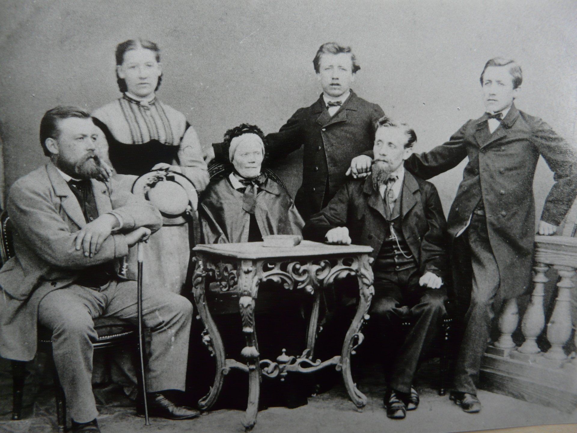 von links nach rechts: August (* 1842) Elise (* 1848), Tante Wilhelmine Christiane Göpel (* 1809), Ernst (* 1850) Wlhelm (* 1841), Georg (* 1845)